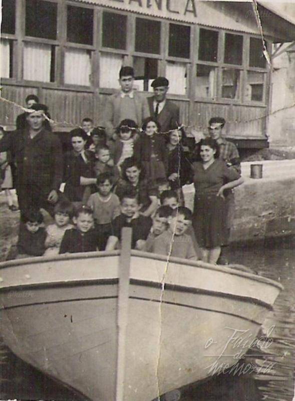 Na foto , donada por Belarmina Ordóñez, tomada ó lado da terraza do Casablanca, nun barquiño, están traballadores da fábrica de conservas PIPLA, entre eles Belarmina Ordoñez cos seus fillos, Lolita, Rubén e Pilar. Pensamos que algun dos nenos de Plaza os acompañen. Estamos a finais dos cincoenta.