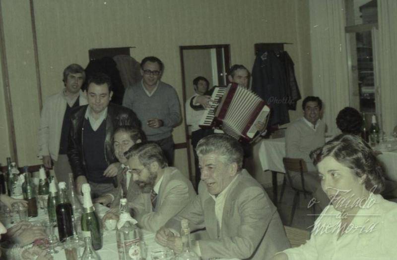 Unha xubilacion no mundo ferroviario, sentado segundo pola dereita Luis Suarez, chofer do colexio de RENFE, situado no Salgueiral, de pé con jersey azul Farruco Troche obrero nos talleres.