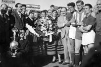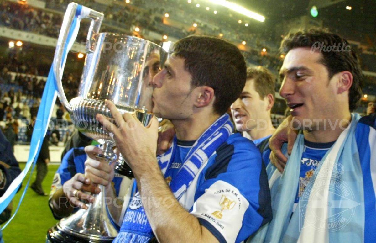 Tristán besa el trofeo de campeones junto a Romero y Scaloni tras ganar la final de la Copa del Rey de 2002, disputada entre el Real Madrid y el Deportivo en el estadio Santiago Bernabéu el 6 de marzo de 2002. El Dépor se impuso por 1-2 al equipo blanco, que celebraba ese día los cien años de su fundación.