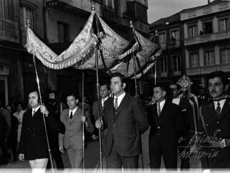 Procesión del Sacramento desfilando por delante de la Confiteria de Prada. Lo normal es que la Custodia fuese debajo del palio, pero en este caso no es así. Los portantes son por la izquierda Lito, Reinaldo del Banco de Bilbao y Moncho Taboada y por la derecha ese tan serio es Luis Prego Carregal, que de serio no tenia nada y Eugenio Villaronga. Al último no le distingo la cara. Cándido
