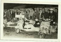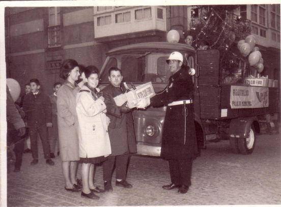 En esta fotografía de Diciembre de 1968, donada por ALBERTO GARCIA BELLO, volvemos a ver una nueva toma del acto de entrega del aguinaldo a la policía municipal ferrolana, por el VESPA CLUB de la ciudad. El día 24, los miembros del Club, hacían un recorrido en Vespa por diferentes establecimientos de la ciudad, recogiendo pequeños obsequios y donaciones, para posteriormente, en comitiva, acercar lo conseguido a sus destinatarios.