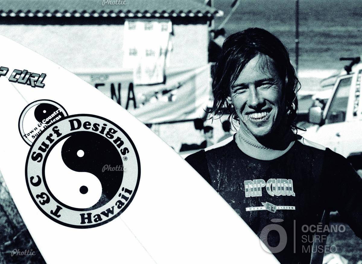 Dave Malherbe, campeón del circuito Open del año anterior en Pantín, regresa a Galicia al año siguiente. Aún lo haría en cuatro ocasiones más. Ese año, 1990, él era el protagonista del cartel del campeonato que entra a formar parte del circuito Pro-Am europeo con un importe en premios de 4.000 €. El australiano John Mills se impone en la final a Spencer Hargraves, Justin Strong y Pablo Postigo. En la imagen, Dave en la playa tras concluir su prueba. Finalmente, quedaría en quinto lugar de la EPSA.