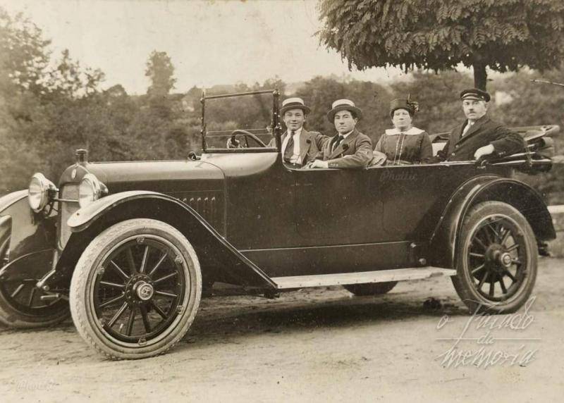 A fotografia, preciosa, do seculo anterior na localidade de Mondariz, na parte traseira do automovil os Pais Vicenta Rubio e Nicolas Alvarez, o seu domicilio na esquina do Barrio da Prosperidad o lateral da edificacion na rua San Jose, conducindo o coche o seu fillo Segundo que co tempo casaria e seria o Pai da lembrada Mary Alvarez, casada con Guillermo Poyan.na foto a o caron de Segundo seu irman Telmo Alvarez