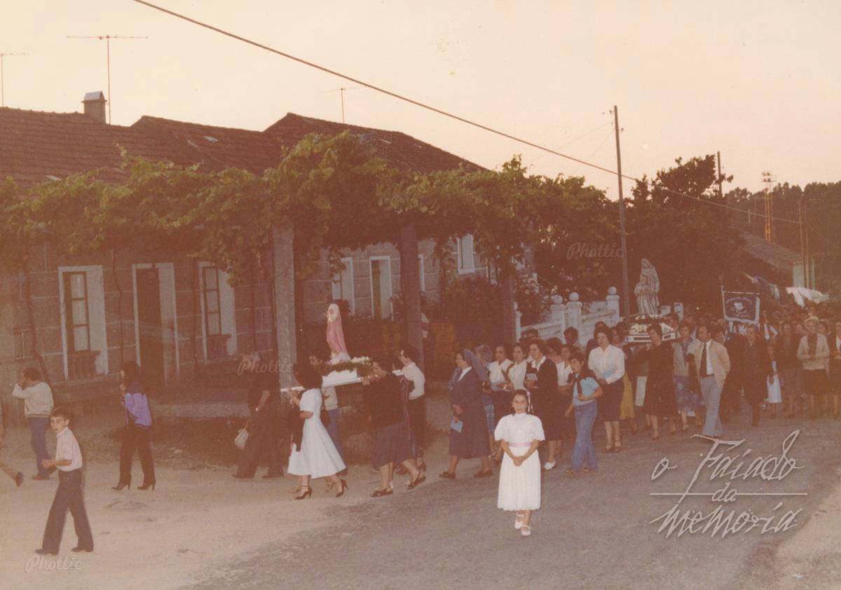 Procesión da Virxe da Xunqueira ao seu paso pola Avda. Agustín Romero e baixada cara á igrexa pola Rúa da Lomba. A casa que fai esquina é a taberna/tenda de señora Lola e señor Moncho. Non sei a data exacta, pero a parroquia da Xunqueira inaugurouse en setembro do 79 e a festa celébrase o último domingo de maio, supoño que será unha das primeiras procesións que se fixeron, porque vivindo eu alí, non recordo que a procesión pasara por diante da miña casa.