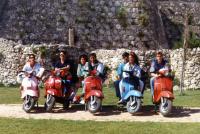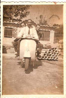En esta fotografía tomada en lo que hoy es el número 375 de la Avenida del Aeropuerto, aparece en primer plano con una impoluta camisa blanca Rodrigo Costas Soto (fundador de la empresa Tito Costas materiales de construcción), a continuación Manuel Costas Rivas (propietario de la Vespa, de oficio carpintero, que se embarcó en el “cable inglés”, trabajó en Citröen , rematando su trayectoria profesional como portero de finca) y Antonio Lago de Cabral (subcampeón de España de soldadura eléctrica mientras trabajaba en Vulcano). Su habilidad con el soplete lo llevó a ser contratado como especialista por Citröen en el desembarco en Vigo de la compañía francesa).