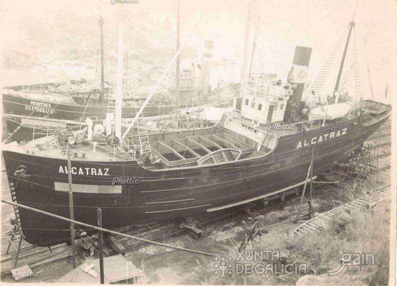 Imaxe dos buques Alcatraz e Merces, no taller de reparación e construción de Factorías Vulcano. No 1919, Enrique Lorenzo, xunto a Ludovico Morlón, enxeñeiro belga apodado "el Francés", fundou un pequeno taller de reparación de caldeiras de vapor na que hoxe é a céntrica rúa Canceleiro de Vigo,"La Vulcano". Imaxe cedida polo Museo do Mar de Galicia.