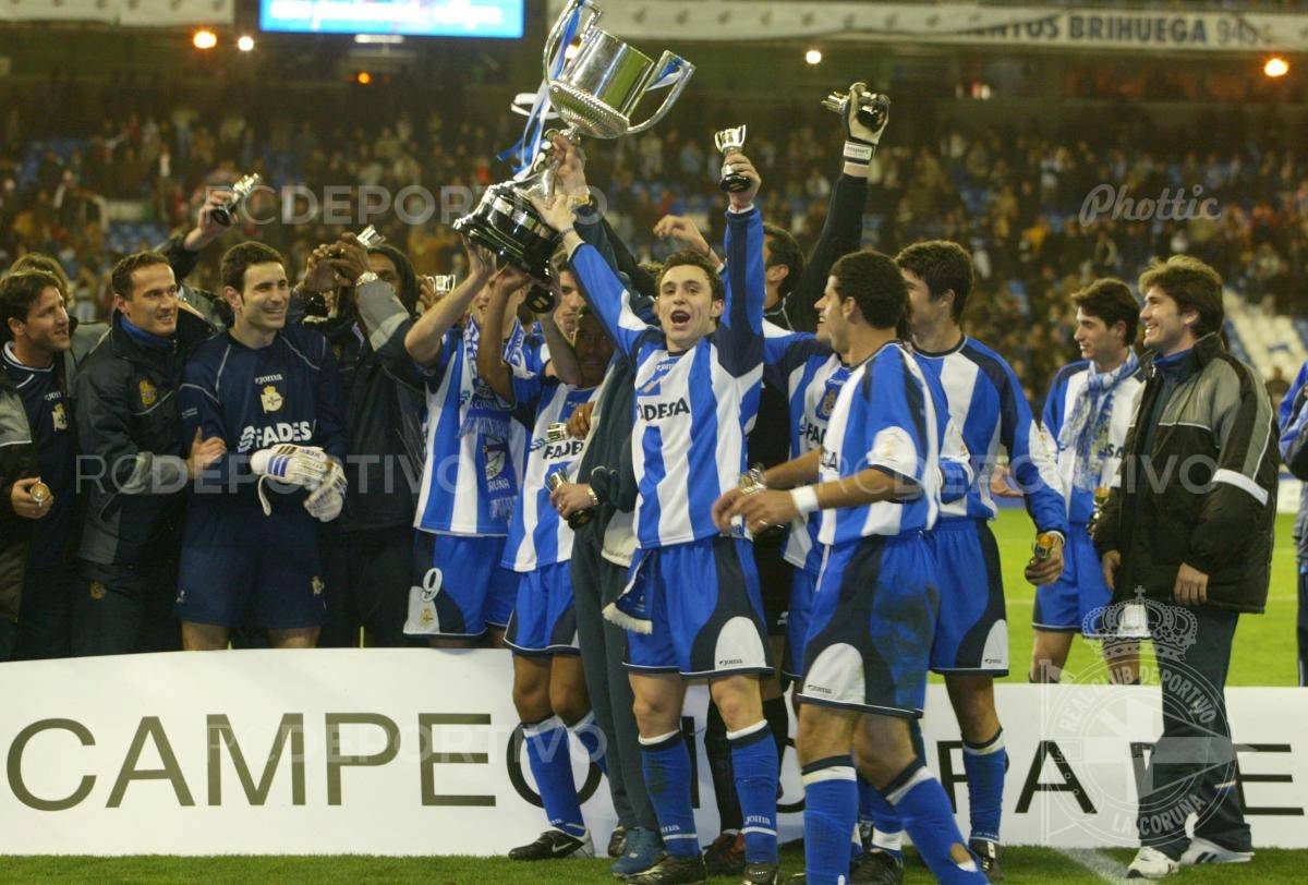 Los jugadores blanquiazules levantan la Copa del Rey de 2002, disputada entre el Real Madrid y el Deportivo en el estadio Santiago Bernabéu el 6 de marzo de 2002. El Dépor se impuso por 1-2 al equipo blanco, que celebraba ese día los cien años de su fundación.