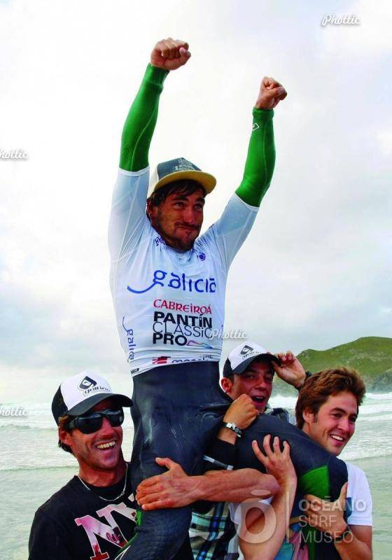 Un Aritz Aranburu triunfante es aupado por sus amigos tras su victoria frente al argentino Santiago Muñiz en el Pantín Classic de 2011. El vasco posiblemente sea la figura más representativa de la mejor generación de surfistas que se haya dado al sur de los Pirineos. Junto a él, Hodei Collazo, Gony Zubizarreta, Luis Rodríguez, Pablo Gutierrez, Jonathan González, …, llenaron los podios del circuito europeo junior. Muchos de ellos tendrían después exitosas carreras en el QS. Él sería el único en llegar al CT, en donde competiría durante tres temporadas. Aparte de sus éxitos deportivos, si por algo además ha destacado Aritz en su paso por Pantín, ha sido por su exquisita educación y profesionalidad. Todo un ejemplo de saber estar, esfuerzo y superación personal.