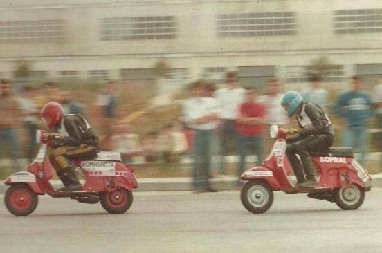 Patrocinado por Sopral, y con su inconfundible casco azul, Manuel Portela sigue la estela de un rival. Era el año 1984. “Lo sé por la publicidad de Porsche, por la pegatina que le pusimos donde va el intermitente”.