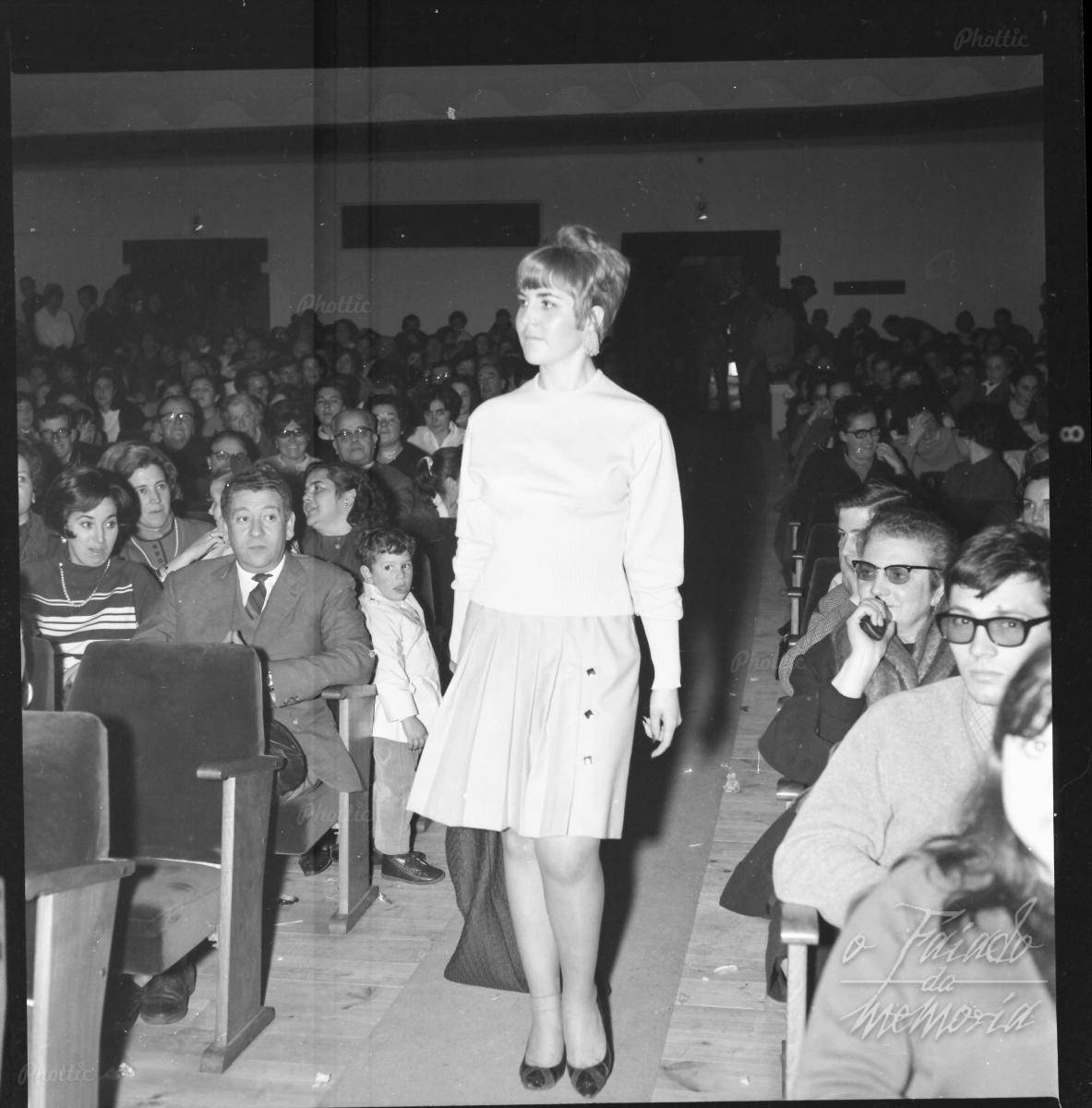 Milos Iglesias, muller innovadora, de profesion peluquera sempre estivo moi relacionada co mundo damoda. Estamos a ver no Cervantes un desfile de modelos, na imaxen Milos, non era facil noa anos sesenta desfilar unha muller nun espacio cheo de xente