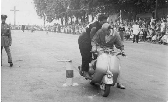 En esta instantánea, tomada a principios de los años 50 en la ciudad de Pontevedra, se puede ver a Rafael Olmedo participando en una gincana popular organizada por el ayuntamiento de la ciudad, en las inmediaciones de la alameda, con el monumento a los Caídos en la batalla de Pontesampaio de fondo. La gincana combinaba diferentes pruebas de habilidad, como sortear unos conos, frenadas precisas, balancines o recoger un clavo para posteriormente clavarlo en un poste… entre otros retos. Y todo ello, bajo la presión del cronómetro en el menor tiempo posible.