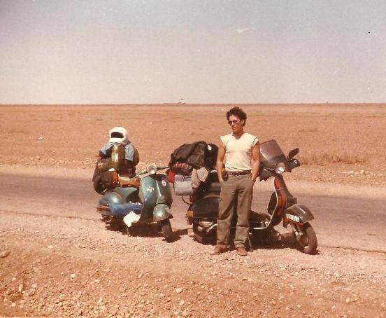 Xerardo conocía unos chorros en Caños de Meca que merecían una escapada. Hubo playa, una cena descomunal. A todo esto era el mes de septiembre. Al día siguiente tiramos para Algeciras. Llamamos a nuestra madre – apunta Alfonso- y nos dijo algo así como: A donde vais, locos e la vida. ¿Y decís que vais a ir a Marruecos? Yo no os dije nada porque pensé que al llegar a Oporto daríais la vuelta. En Ceuta Xerardo tuvo que cambiar el cable del embrague que estaba sostenido solo por un hilo. El del taller al ver la matrícula PO, nos preguntó si éramos de Portugal. Pues no, de Pontevedra. Cruzamos en el Ferry sin ningún problema pero al llegar a Marruecos, como la moto estaba a nombre de mi vecina y no traíamos la carta verde, se nos complicó la cosa. Nosotros mucha experiencia en estos temas no teníamos, pero después de un buen rato, nos dimos cuenta que aquellos policías marroquís lo que querían era pasta. Se la dimos a una especie de conseguidor y después de esperar un rato, nos dejaron pasar. Esa noche dormimos en Tánger. Al día siguiente nos dirigimos hasta Rabat. A Rabat llegaríamos a eso de las ocho o nueve de la noche, en plena hora punta, con vehículos y gente hasta donde te alcanzaba la vista. Se nos iban pegando unas motitos que aparecían de todos lados con un par de tíos encima, que no se despegaban de ti. Nosotros queríamos llegar por nuestros propios medios a un cuchitril que habíamos visto en la guía del trotamundos, pero ellos te iban sonsacando. Que si eras italiano, que si a dónde vas, que si necesitabas un hotel… Nosotros repito, que viajábamos sin un duro, si en la guía decía que se dormía por tanto, encontrábamos otro sitio en el que se pagaba la cuarta parte. En Rabat sí que descansamos. En un hotel de estos estilo colonial por catro patacos. Un hotel no, más bien una pensión. Debimos estar allí unos tres días.