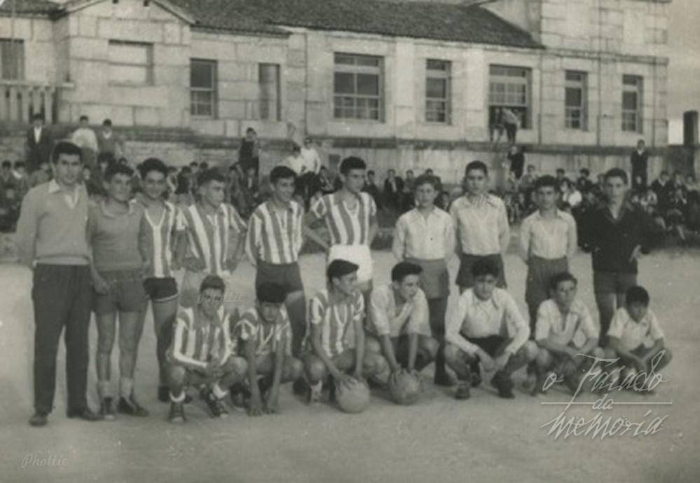 Si no me equivoco es un partido de infantiles en el Campo del Frente de Juventudes entre la Acción Católica y un equipo de Carril.Creo reconocer empezando por la izquierda de pié a Tatá(que hacía de entrenador),el 4ºConles,abajo el 1ºSisán+,Gil+ y Dito Abalo.En el equipo de Carril,el 1ºde pié por la derecha:Tonecho,Venancio,Jueguen,?,y abajo,por la derecha:Suso Berride,Camilo Dios+,Juan Antonio y Cunino.