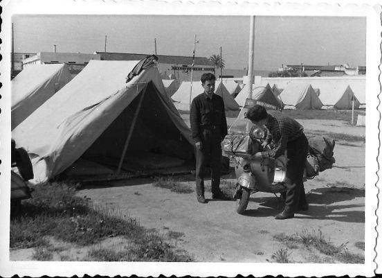 Fotografía tomada en el campamento. Delante de la tienda, los hermanos Docampo tratando de ajustar uno de los numerosos petates que con cuerdas llevaron amarrados al Rally Camping de Sevilla de 1958 desde A Coruña.