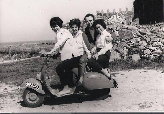 En esta otra fotografía posan el Sr. Fulgencio acompañado nuevamente de Fina y dos de sus amigas: Queti y Francisca Solana (Loli). Nos comenta Fulgencio que "durante años, con esta moto y con otra de 125cc., recorrimos todo el sur de Galicia. Hasta que un día, allá por 1966, presencié a escasos metros, por una falta de prudencia del motorista, un gravísimo accidente. Ese día "colgué" la moto y no volví a subir hasta el año 2009. Fue mi hijo Ginés quien me devolvió el espiritu Vespista”.