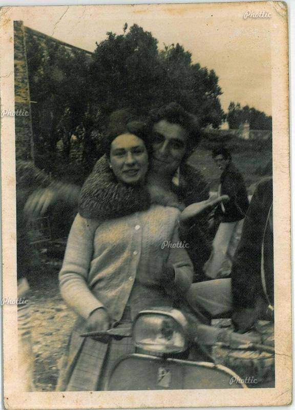 Gracias a la gentileza del CONCELLO DE AS PONTES, hoy compartimos esta fotografía que también está documentada en su magnífico archivo fotográfico. En ella aparecen Raimundo Barro Cabarcos y Celia Pena Fresco posando en la vespa del hermano de esta última, Manolo. La foto fue tomada en la taberna DO DEVESO, delante de la escuela unitaria, camino del baile de Trastoy.