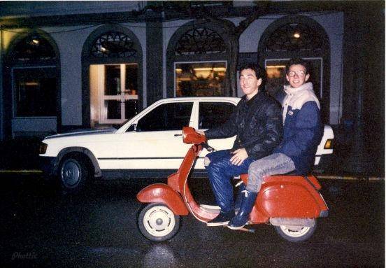 Fernando Rial en Vespa a la salida de una fiesta del Instituto