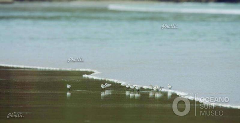 En Pantín, al igual que en las playas de Doniños o A Frouxeira, se encuentra una de las más importantes lagunas costeras de la geografía gallega, formaciones que fueron realmente pequeñas rías hace milenios cuando el clima en nuestra región se caracterizaba por ser frío y árido. Estas pequeñas rías, allá por el Cuaternario, se fueron llenando de arena hasta formar una barra que las cerró frente al mar; una gran duna que se anteponía en la lucha entre las aguas que bajaban por los ríos y regatos del valle, y las mareas y olas del mar. La barra de arena terminó por aislar estas zonas del ocáno parcial o totalmente. Después la llegada de nuevos sedimentos, arrastrados por los ríos, fueron llenando paulatinamente la laguna, ayudando con su presencia al asentamiento de la vegetación que poco a poco fue colonizando sus bordes, creando en Pantín un entorno de gran valor medioambiental por la fauna y flora que en él habitan. Y rodeados de todo este entorno, del océano Atlántico, del carrizal, y de los picos da Burneira y Os Penedos, se encuentran la playa y las olas de Pantín. En la imagen, uno de los habitantes más característicos de esta zona, los correlimos (Calidris alpina).