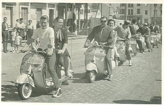 Entre las numerosas tradiciones del Vespa Club Ferrol, esta fotografía nos lleva a hablar de dos de ellas en particular. La primera era "La excursión de la tortilla", a la cual corresponde esta fotografía de mediados de los años 60. De caracter dominical, consistía en pasar el día en una playa o arboleda, compartiendo tortillas, empanadas y otras viandas.