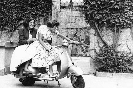 Esta fotografía de 1958 es una donación de Don Sergio Saborido Comesaña, propietario del Colegio Labor, ubicado en la Avenida de las Camelias en Vigo. En ella aparece su hermana (María José Saborido) sentada de copiloto y una amiga (de la cual sólo recuerda el nombre, Ana María) a los mandos de la Vespa. La foto fue tomada en el interior de dicho Colegio. El Sr. Saborido recuerda que la Vespa era una Sport pintada en color plata, con matricula PO 10993 y aunque las faldas de las dos jóvenes impiden apreciarlo, tenía el asiento corrido. Él la compró en el conocido concesionario vigués Kaifer, en el año 1954, por un total de 11.000 pesetas (unos 66 euros al cambio). Según nos comentó, la vendió a mediados de los sesenta, tras disfrutar de su conducción casi una década.