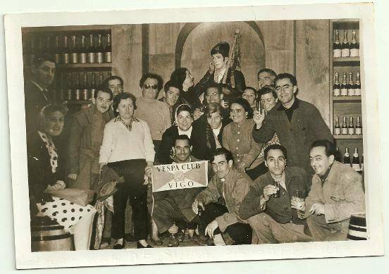 Aquí tenemos a parte de la expedición Viguesa que acudió hasta el "Primer Rally día de América" en Asturias, posando en las instalaciones de Sidra el Gaitero... "famosa en el mundo entero". El Sr. Moreira aparece de cuclillas a la derecha de la faja del VESPA CLUB VIGO. Por su parte, María del Carmen es la sonriente joven con el pelo recogido en una trenza, que aparece bajo la figura del "Gaiteiro". Cuentan, que dentro de las actividades del Rally, los asistentes disfrutaron de la actuación estelar de una jovencísima y espectacular Carmen Sevilla.