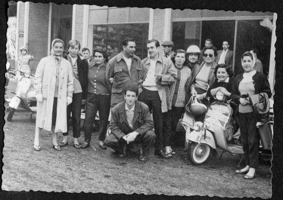 Nueva instantánea del nutrido grupo del Vespa Club Vigo que en 1958 se desplazó a Oviedo a participar en el "I Rally día de América". De derecha a izquierda aparecen la mujer de Álvaro Fernández (autor de la foto), Montse (esposa de Javier), una señora de gafas oscuras de la que Carlos Moreira no recuerda el nombre, Paino y su esposa Loli, el propio Sr. Moreira, Ribeiro y su esposa y Carmen del Río (recientemente casada con Carlos Moreira). Abajo, de cuclillas, se encuentra Javier.