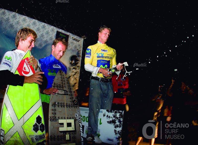 Los mejores de 2007 en el podio de Pantín. De izquierda a derecha: Aritz Aramburu, que conseguiría en el 2007 ser el primer español en entrar en el circuito WCT, Eneko Acero y el alemán Marlon Lipke, el vencedor del campeonato. Tras ellos, casi oculto, el australiano Darren O´Rafferty, segundo clasificado.