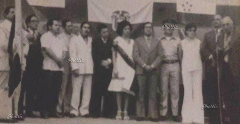 Autoridades municipales. gubernamentales y de policía de la ciudad de Milagro, cerca a Guayaquil, observan el paso de un desfile conmemorativo por la Cantonización en 1974. Fotografía de Ricardo José Rodríguez Barcia.