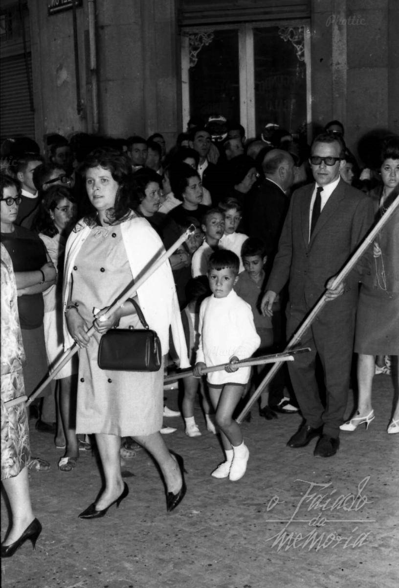 De gafas cos brazos cruzados observando a procesion vemos a Lolita Cajaraville, muller admirable, traballou arreo para sacar a sua familia adiante con todas as limitacios fisicas que tiña, Lolita vendia cupons, de aquelas mulleres que si foron pero de verdade, madres coraje. Na nosa memoria