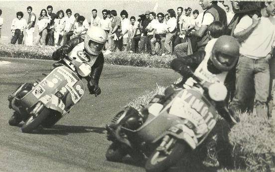 9 de Octubre de 1983. Fotografía correspondiente a las dos horas de resistencia en Vespa, disputadas en el circuito urbano de Bouzas en Vigo. Con el público a pie de pista y tan solo separados por unas balas de paja, en primer plano aparece Jose Cardama corriendo para Vimoto. A su estela, Manuel Alonso patrocinado por Hipermar y Porsche.