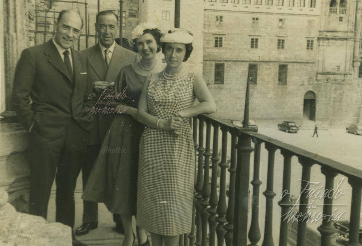 Manolo Tourón junto con Maria fueron los que atendieron a mi madre cuando dió a luz a este hermosote varón y con 42 años mi madre la cosa estaba complicada, pues los partos eran en casa, pero todo salió bien y yó salí entero.En casa era un mito y lo queríamos muchísimo, pues aparte de buen médico era una magnifica persona. En la foto, por el tocado de las señoras, deben ír de boda y el lugar no lo sé, pero tiene pinta de ser Santiago. El matrimonio que los acompaña es Rafael Sanmartín y señora, que espero le suene a Margarita pues tienen algo en común. Era propietario de bateas y tenia un comercio de ropa en Rey Daviña llamado Confecciones Villamar, en frente a las Reunidas y vivia en el edificio de Olmedo. Cándido