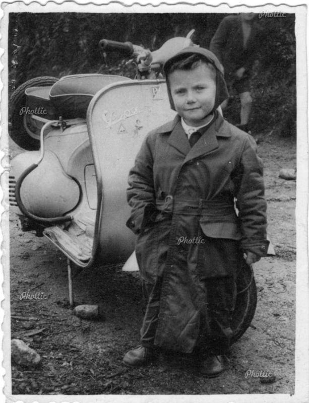 Delante de una vespa, posa el joven Pepe de Areas, quien como se puede observar, salió de casa bien equipado en lo que parece una lluviosa jornada invernal. Seguro que más de uno se ha fijado también en lo resbaladizo que se encontraba el firme y en la cantidad de piedras, surcos y ramas que un vespista de finales de los años 50 se encontraba en sus trayectos diarios.
