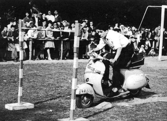 Gracias a Óscar Rodríguez, contamos con esta fotografía tomada en el campo de fútbol de la localidad lucense de Sarria con motivo de las fiestas patronales celebradas en 1961. Con una faja del Vespa Club Lugo, el participante se dispone a pasar por debajo del listón. Además de pasarlo completamente agachado, si nos fijamos en la parte inferior de la fotografía, podemos comprobar como la organización colocó una guía-barrera encurvada en el suelo, obligando a los participantes a afrontar el obstáculo medio ladeados.