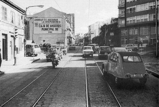 Fotografía tomada en el "cruce de los Llorones", formado por la afluencia de las calles Pizarro, Urzáiz y Travesía de Vigo en 1970. Recogida en varias publicaciones digitales (Barrio de o Calvario, Faro de Vigo o Vigo antiguo, entre otras) llama la atención el cartel de la Caja de Ahorros Municipal de Vigo (hoy Nova Galicia Banco) en el que hace un llamamiento al ahorro. Muchos recordarán a Pepe vendiendo los "cupones de los ciegos" debajo de este emplazamiento publicitario. Justo enfrente, se encontraba el desaparecido Bar Cabanelas, donde además de comidas caseras, se iba a jugar a la llave. Al fondo a la derecha, las inconfundibles escaleras del Colegio Mariano.