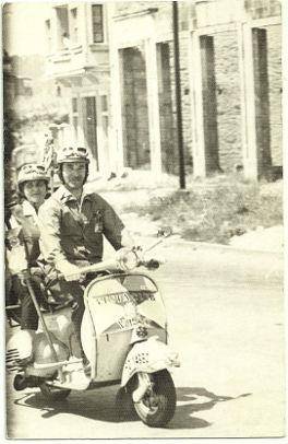 Julián Mouriño en pleno desfile hacia la Plaza del Obradoiro con motivo de la Peregrinación nacional en Vespa a Santiago. 19-6-1965.