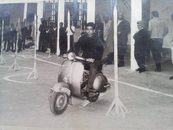 Esta foto data de principios de los sesenta. Jesús no recuerda la fecha con exactitud. Pero cree que podría ser 1963. El Vespa Club de La Coruña, cuyo Presidente por aquella época era D. José María Arrojo, organizó una gymkana para el entretenimiento de los enfermos hospitalizados en el antiguo Hospital de Oza. Jesús recuerda su participación junto con otros compañeros vespistas coruñeses. La Vespa con la que participaba había sido comprada a Arrojo, en la tienda de la calle Alfredo Vicenti de La Coruña, por un precio de 22.000 pesetas. Todo un dineral en aquella época. Esta misma Vespa (C-27897) de color azul, pasados unos años, fue vendida a un sobrino de su mujer cuando Jesús se hizo con su primer vehículo de cuatro ruedas (algo bastante común y habitual por aquellos años). Anteriormente, se había comprado una Vespa 150 del 59 (C-17706). De segunda mano a un familiar suyo.