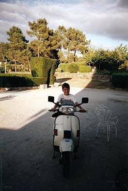 Según nos comenta Alexandre, la fotografía fue tomada por su padre en casa de unos familiares en la localidad de A Lonia (Ourense). La Vespa TX200 era de un amigo de la familia que se encontraba aquel día de visita. La foto surgió de un cajón lleno de fotografías con solera en la Navidad 2008. Un sorprendente hallazgo, ya que Alexandre (actualmente enrolado en las filas de los Avispados de Ourense) no recordaba tener una foto de su infancia subido a una Vespa. Tres meses después de este descubrimiento, Alexandre adquirió una moto igual, aunque de 125 y negra (Vespa T5). Sobre aquella Vespa del 93, recuerda un pequeño percance que le pasó jugando al baloncesto con sus primos. En un desafortunado lanzamiento a canasta, el balón salió despedido en dirección al scooter. Y como era de esperar, el balón rompió uno de los retrovisores. Sus primos compinchados, le hicieron creer que los espejos eran unas piezas muy, muy caras y que por mucho que recurriese a sus ahorros, no sería capaz de reunir dinero suficiente como para pagar semejante destrozo... Por cierto, sabemos de muy buena tinta que esta Vespa se ha pintado de granate y ahora circula por las calles de Vigo.