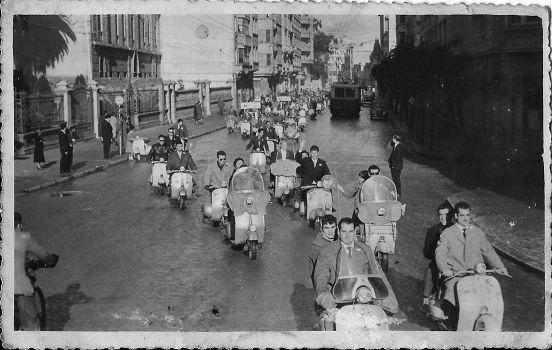 Nueva aportación fotográfica de fotos Antiguas de La Coruña. Datada en los años 50, se puede ver a un considerable número de vespistas desfilando por la Calle Juan Flórez. Justo por delante del Colegio de las Josefinas. A la izquierda, con la verja y la palmera, “La Artística”. Encabezando la comitiva nos encontramos a D. José María Arrojo Aldegunde (Propietario del concesionario oficial Vespa de la ciudad herculina) acompañado de su esposa, la betanceira Carmucha Fernández. Probablemente se trate de una salida navideña del Vespa Club La Coruña (con motivo de la entrega del aguinaldo al guardia o en el día de la Cabalgata de Reyes). Sorprende ver al pelotón circulando sin casco, pero debemos recordar que no se hizo obligatorio su uso, hasta bien entrados los años 80.