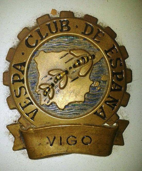 Chapa metálica del Vespa Club Vigo de los años 50 cortesía de la directiva del refundado Club. Al contrario que otros elementos recogidos en este archivo, la chapa carece del escudo de la ciudad (el castillo y el olivo) que si se puede apreciar en el banderín.