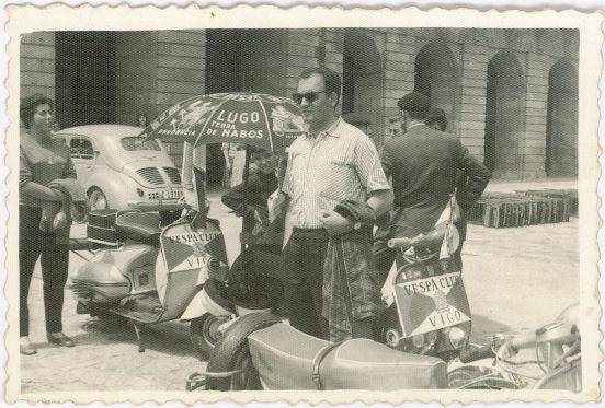 El sol a esas horas de la mañana ya apretaba en Santiago de Compostela. Al Señor Trigo, le sobra la chaqueta. De fondo una curiosa sombrilla de "Lugo, tierra de Nabos". Guillermo, hijo de Manuel Trigo Cebreiro, nos comenta que su padre nació en Lugo. "Cuando vió esa sombrilla, no se pudo resistir a inmortalizarla. Decía que Lugo era la mayor base "nabal" del mundo".