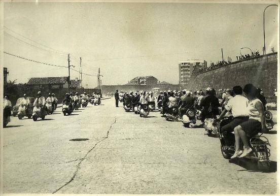 De cara a entrar todos juntos en la Plaza de O Obradoiro, los participantes en el I Rally Gallego se disponen a salir agrupados desde las inmediaciones de la estación de trenes santiaguesa. Esta fotografía tomada en julio de 1959, ha sido donada por Jorge Negreira.