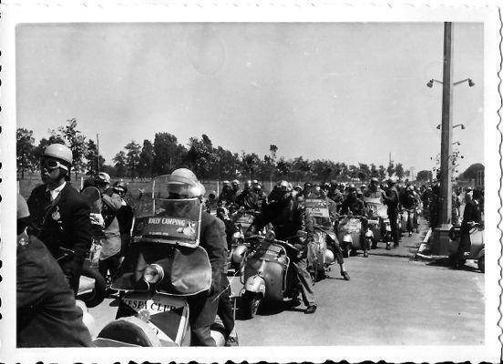Correspondiente a una de las rutas del Rally Camping de Sevilla, se puede distinguir la faja de un participante del Vespa Club Vigo del que desconocemos su identidad y por la mitad del agrupamiento, a Pepe Docampo con su scooter. Como era habitual en estas salidas, los vespistas formaban dos filas a la hora de afrontar cualquier travesía.