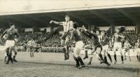 Acuña atrapa el esférico en presencia de Oñoro durante el partido de la 3ª jornada del campeonato de Primera División de la Temporada 1949-1950, disputado el 18 de septiembre de 1949 en el estadio de Nervión, entre el Sevilla y el Deportivo. El resultado final fue de empate (2-2).