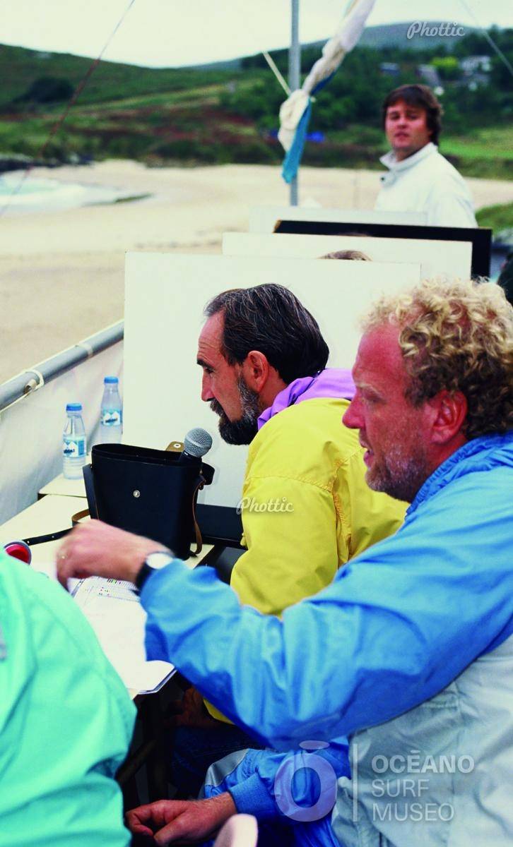 Martin Rich y Vicente Irisarri actúan como maestros de ceremonia y comentaristas en la edición del Pantín Classic de 1992, apostados en la terraza de la caseta de socorrismo de la playa. Al fondo, Aitor Aguirremota, que no se ha perdido ni una edición del Pantín en donde ha actuado como juez y, dentro del plantel de la ASP, ha alcanzado el máximo nivel. Los tres forman parte de los "esenciales" de la organización y crecimiento del campeonato.