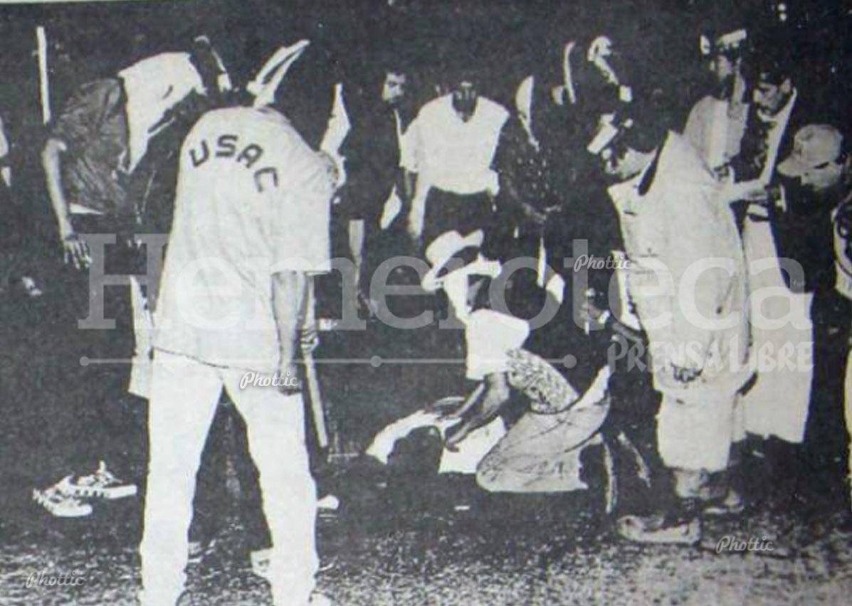 El 10 de abril de 1992, en las cercanías del Paraninfo Universitario, miembros de la Fuerza de Tarea Hunahpú abrieron fuego contra un grupo de estudiantes universitarios, que preparaban carrozas para el tradicional desfile bufo de la Huelga de Dolores. En el lugar falleció por impactos de bala, el estudiante de la Escuela de Formación de Profesores de Enseñanza Media de la Universidad de San Carlos, Julio Rigoberto Cu Quim y resultaron heridos otros 7 estudiantes. La Fuerza de Tarea Hunahpú estaba conformada por elementos de la Policía Nacional, Guardia de Hacienda y Policía Militar Ambulante. Esta unidad, fue denunciada por la Iglesia Católica, durante el gobierno de Jorge Serrano Elías, como “el instrumento principal de una política represiva coordinada por el Ejército” (Enfoprensa No 490). Foto de la Hemeroteca Digital de Prensa Libre.