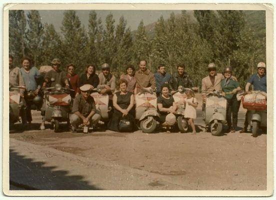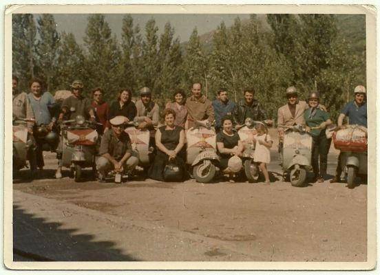 "Baños de Montemayor (Salamanca). Viaje de ida a Vuelta a Andalucía en Vespa. 12 de julio de 1963". Comitiva Vespista de Vigo y Pontevedra. Fotografía aportada por Julián Mouriño, en pie con su mujer María Estrella, posando con su vespa (4ª empezando por la derecha) y faja del Vespa Club Vigo.