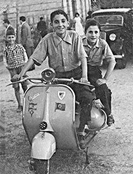Nos cuenta Nacho Mirás Fole, que los que los dos jóvenes que salen sonrientes en esta foto son José Mirás Domínguez, su padre (con 13 años), y Joaquín Otero Vilas "Quinito" (con 14 años). Ambos eran vecinos de O Sobreiro, en Lavadores. La instantánea fue tomada en las fiestas de Santa Cristina de Lavadores en Vigo, más concretamente en junio de 1956. Según relata Joaquín, la Vespa (con las banderas de España y Portugal, y los escudos del Celta y del Athletic Club de Bilbao) pertenecía a un fotógrafo. Un hombre grandote, corpulento, con uno de esos cuidados bigotillos que se lucían por aquel entonces. Al parecer este señor era un habitual de este tipo de festejos populares a los que acudía siempre con su Vespa y con un sombrero mejicano en la cabeza. A la hora del retrato, sus improvisados modelos tenían dos posibilidades: podías hacerte una foto con el sombrero o si no, sentado en la moto como acontece en esta ocasión. Aunque aquí la vemos ampliada, decir que este tipo de fotografías eran de unas dimensiones muy reducidas.