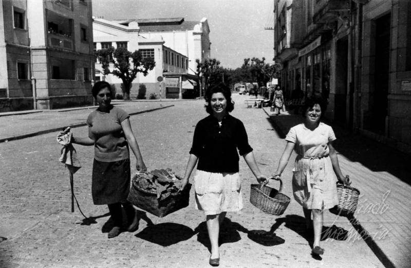 Posiblemente dos seus campos, da Praza de Abastos, estas tres mulleres marchan pra as suas casas cos seus cestos valdeiros. Atras a dereita unha das leiteiras que surtian de leite a vila
