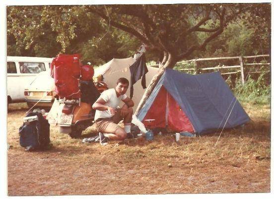 "Esta foto -comenta Benedicto Méndez- está tomada en el camping de picos de Europa. En el año 1977 más o menos. El caso es que siete días después de comprarla, iba yo a trabajar a Citröen, y a la altura de la gasolinera de Bouzas un coche me arrincona tanto… que al final caigo, con la mala suerte que otro coche me lleva por delante. Rotura de ligamentos, cuatro operaciones… no se como salí vivo de aquella".