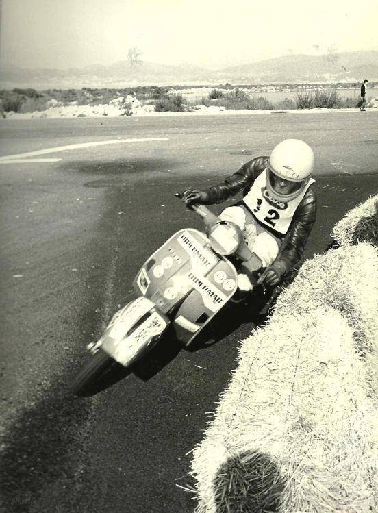 Fantástica fotografía de Manuel Portela acometiendo una curva de izquierdas en las dos horas de resistencia en Vespa del circuito urbano de Bouzas. Era el año 1983. En esta pruena, corrió haciendo equipo con su inseparable compañero y amigo Alberto Alonso.